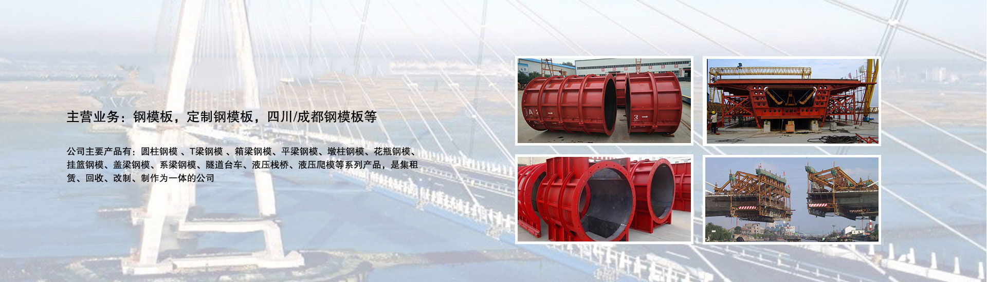 我公司主要產(chǎn)品有:圓柱鋼模 、T梁鋼模 、箱梁鋼模、平梁鋼模、墩柱鋼模、花瓶鋼模、掛籃鋼模、蓋梁鋼模、系梁鋼模、隧道臺車、液壓棧橋、液壓爬模等系列產(chǎn)品,是集租賃、回收、改制、制作為一體的公司。